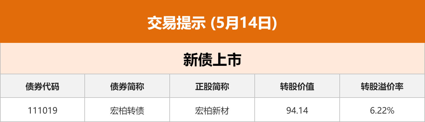 利率债:5月13日,银行间主要利率债收益率多数下行。截至北京时间17:30,30年期国债活跃券230023收益率下行2.35BP报2.549%,10年期国债活跃券240004收益率下行1.90BP报2.292%,5年期国债活跃券240001收益率下行3.25BP报2.1%。国债期货全线收涨,30年期主力合约大幅上涨,午盘涨0.54%。此外,10年期国债期货主力合约涨0.15%,5年期主力合约涨0.11%,2年期主力合约涨0.07%。