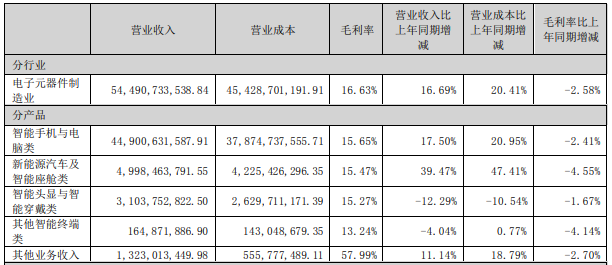 不过,蓝思科技上述三项业务2023年的毛利率均出现下滑,下滑幅度分别为2.41个百分点、4.55个百分点、1.67个百分点。