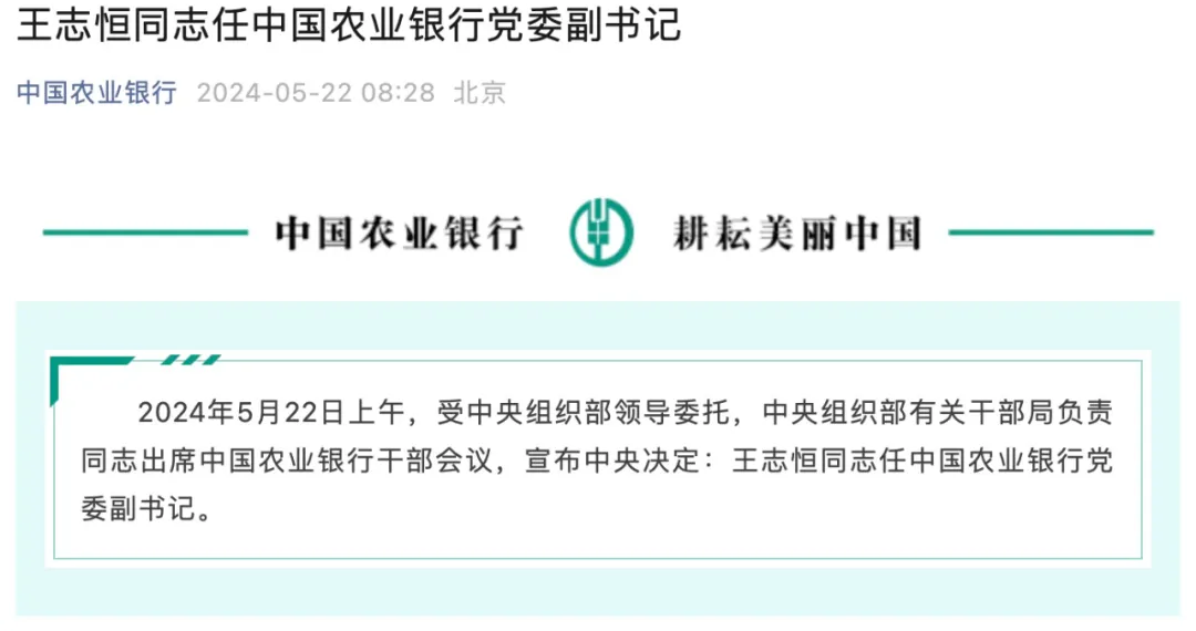 据中国农业银行消息,2024年5月22日上午,受中央组织部领导委托,中央组织部有关干部局负责同志出席中国农业银行干部会议,宣布中央决定:王志恒同志任中国农业银行党委副书记。