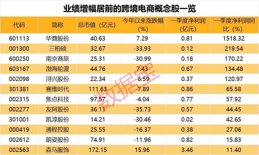 业绩方面,今年一季度,跨境电商概念股几乎全线盈利,仅跨境通一股亏损0.17亿元;汤臣倍健、小商品城的净利润规模均超7亿元。业绩增幅方面,华鼎股份、三柏硕、南京商旅、渤海轮渡、浔兴股份5股的净利润同比增长超100%。