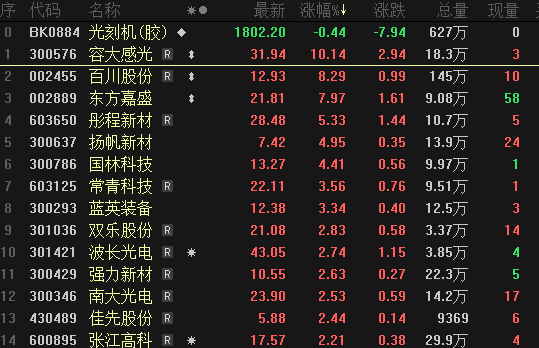 沪指早盘红盘震荡,创业板指走势较弱,光刻胶概念股盘中异动拉升,容大感光涨超10%,扬帆新材、彤程新材、南大光电、强力新材、晶瑞电材等快速跟涨。