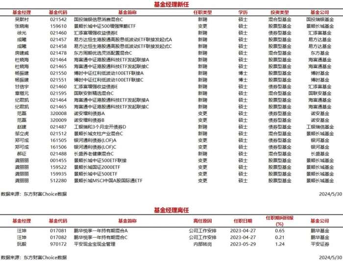 南方财经5月30日电,据东方财富Choice数据统计,今日新聘基金经理16人,涉及22只基金(A/C类分开计算),主要来自景顺长城基金、海富通基金等公司。另外,今日有2位基金经理离任。
