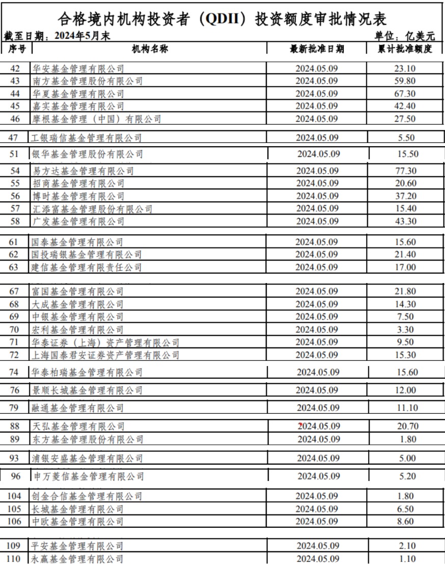 进一步来看,目前累计批准额度超过50亿美元的是易方达基金、华夏基金和南方基金,分别为77.3亿美元、67.3亿美元和59.8亿美元,相比于4月末的76.8亿美元、66.8亿美元、59.40美元,均有小幅增加。