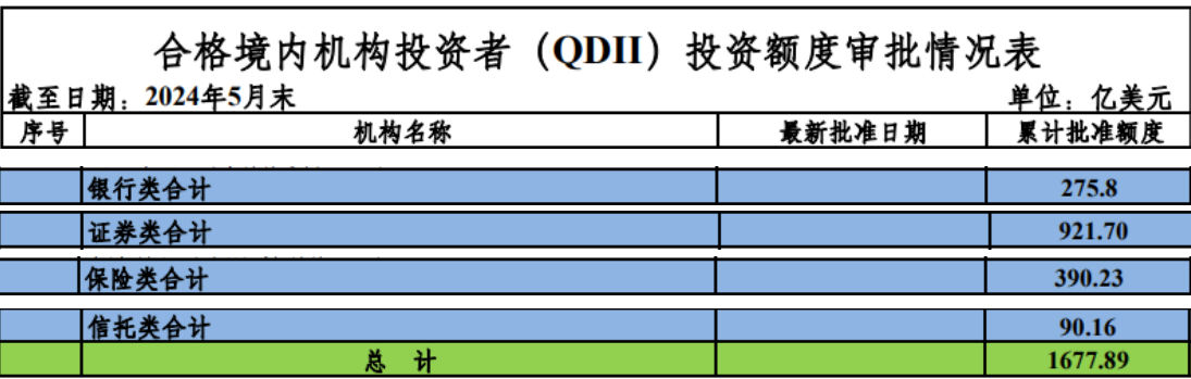近日,国家外汇管理局更新了合格境内机构投资者(QDII)投资额度审批情况表,截至5月底,累计批准额度为1677.89亿美元,相比于4月底的1655.19亿美元小幅增长。