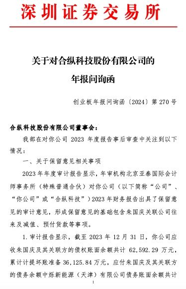 问询函称,深交所在对合纵科技2023年度报告事后审查中关注到以下情况:
