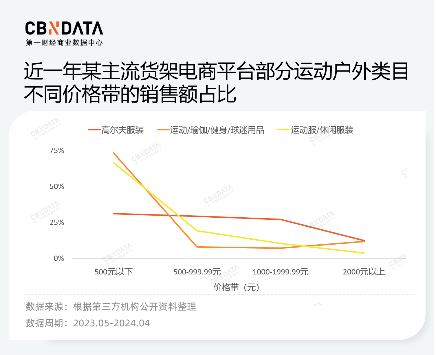尽管高尔夫运动呈现出典型的大众化趋势,也有越来越多品牌加入这一赛道,但高尔夫用品的价格仍未被“打下来”。品牌们的专业高尔夫系列服装,普遍价格在千元以上。相对其他运动品类,高尔夫服装各价格带的销售额分布更加均匀,千元以上商品也能够“卖得好”。这在某种程度上证明着,或许高尔夫运动离真正“下凡”尚有一定距离。或者说,高尔夫的年轻受众们本不在意高尔夫运动“应该”需要哪些专业装备,而更注重Golfcore所蕴含的个性表达与松弛感。