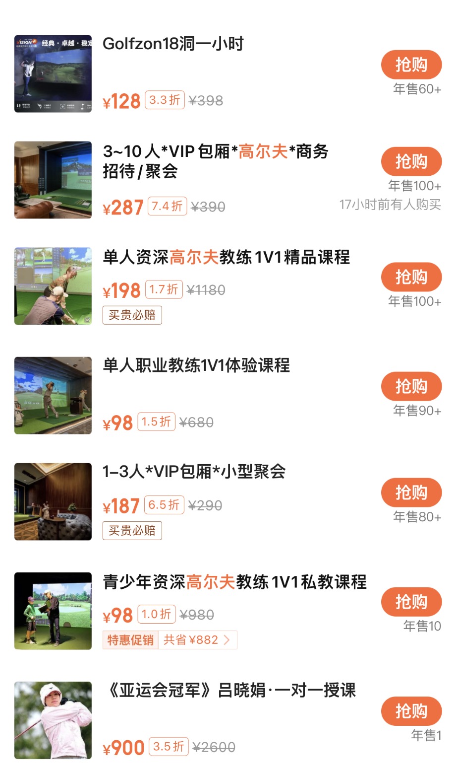 数字技术的进步也打破了场地限制,为消费者带来了更多样的体验高尔夫运动的方式,比如利用高尔夫模拟器打一场“室内高尔夫”。与传统高尔夫球场需要占用大量土地不同,室内高尔夫是在航拍建模和3D还原技术的基础上,通过投影仪和高速摄像头,让用户在室内体验真实打球。这极大弱化了高尔夫的“高端运动”标签,让其更像一种日常休闲娱乐活动。大众点评页面显示,不少商家推出了新玩家体验、1V1教学、朋友聚会、家庭亲子、冠军教练教学等多类型的团购,价格从百元以下到千元不等,降低了大众体验高尔夫乐趣的门槛。某专注高尔夫室内模拟器研发的科创企业表示,接下来还计划将高尔夫与元宇宙结合,创造出更加沉浸、互动性更强的高尔夫模拟器。