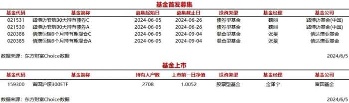 南方财经6月5日电,据东方财富Choice数据统计,今日共有4只基金首发募集(A/C类分开计算),包括2只混合型基金、2只债券型基金。另外,今日有1只基金上市。