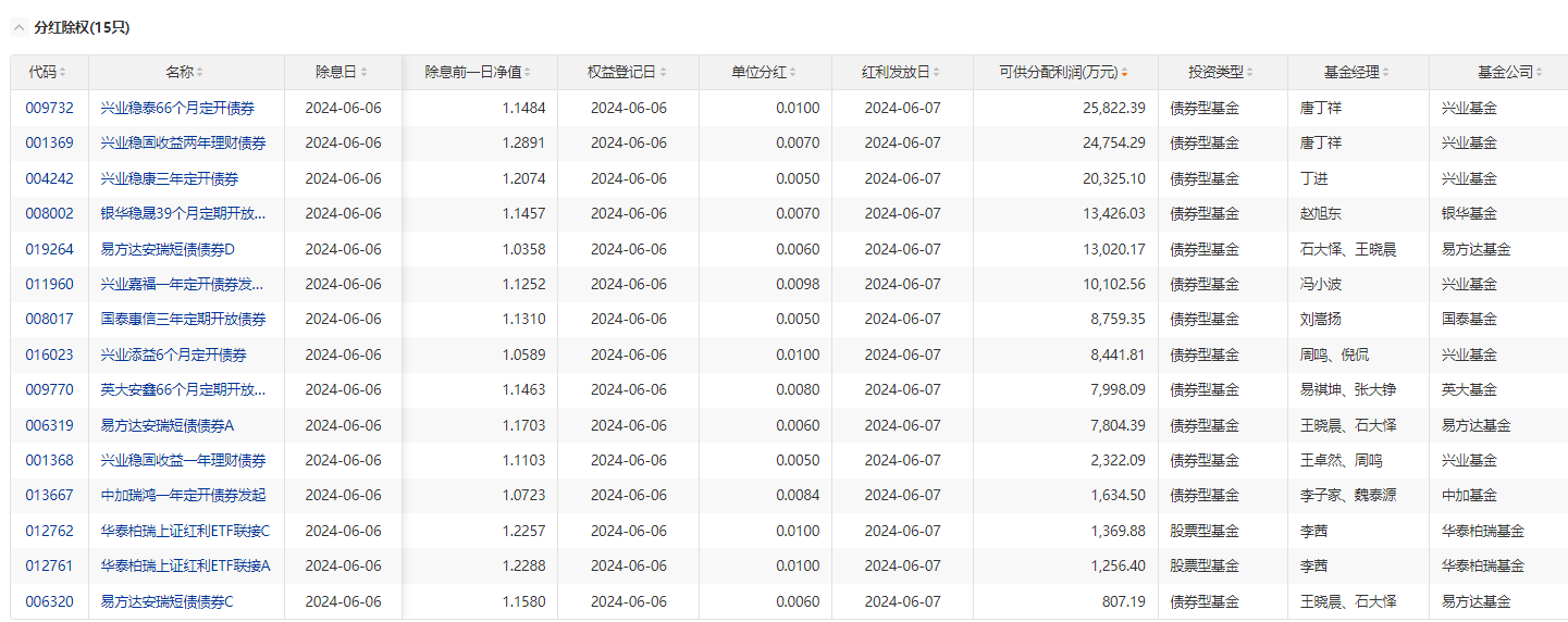 (原标题:今日15只基金分红除权 累计可供分配利润14.78亿元)
