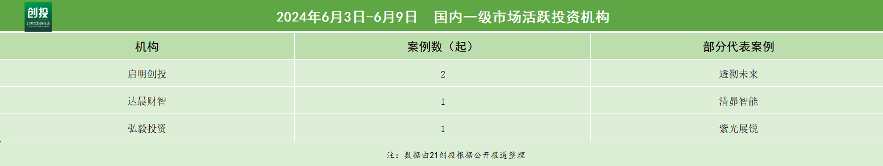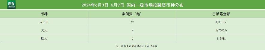 21创投不完全统计,6月3日—6月9日,报告日期内国内一级市场发生融资事件27起。27起融资均披露了融资金额和币种信息,总规模超103.8亿元人民币。