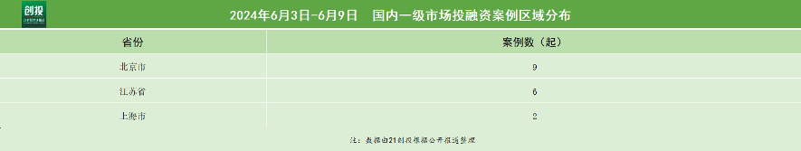 从披露获投企业的地域分布来看,本周的融资地区主要集中在北京市、江苏省和上海市,北京市完成9笔融资,江苏省和上海市各完成6笔、2笔融资。