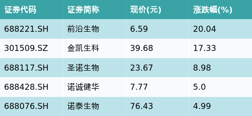 南方财经6月21日电,南财金融终端显示,今日生物医药主题走强,截至午间收盘(下同)上涨0.3%。持有生物医药主题股票的华安中证细分医药ETF(512120)早盘下跌0.52%,最新价报0.379元。截至上个交易日(6月20日),该基金近五个交易日净值(复权单位净值,下同)下跌4.28%,近一个月净值下跌8.65%。该基金自(20131204)成立以来净值增长率为14.0%,管理人为华安基金管理有限公司,基金经理为苏卿云。截至午间收盘,生物医药主题涨跌幅最高的五只股票为:前沿生物(688221.SH)、金凯生科(301509.SZ)、圣诺生物(688117.SH)、诺诚健华(688428.SH)与诺泰生物(688076.SH)。详情见下表: