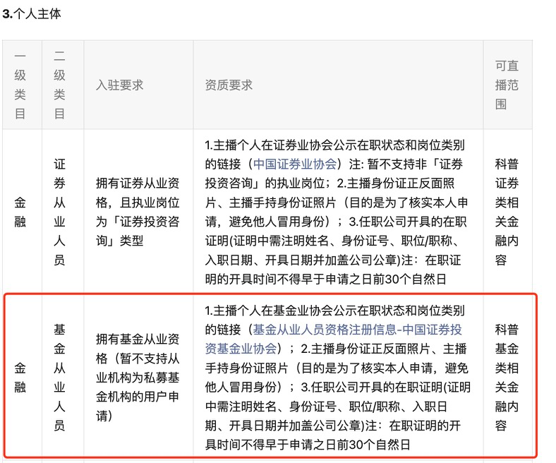 近期,微信视频号发布了更新版本的《视频号金融科普类直播准入标准》(下称“《标准》”),更新生效日期为2024年6月18日。其中,在基金从业人员入驻要求方面,《标准》新增“暂不支持从业机构为私募基金机构的用户申请”等。