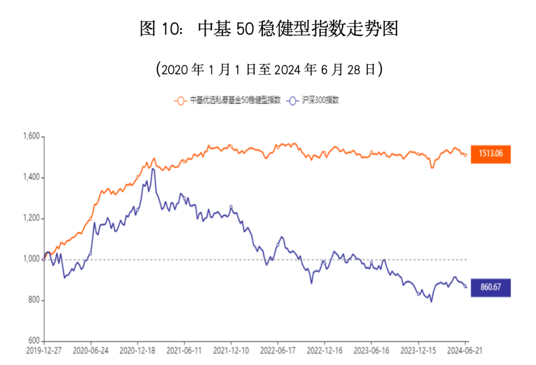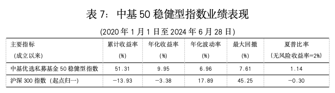 中基优选私募基金50指数的首个二级指数——中基优选私募基金50稳健型指数(以下简称“中基50稳健型指数”)的基准日为2020年1月1日,指数在2024年上半年表现良好。