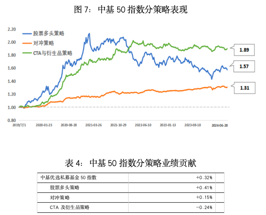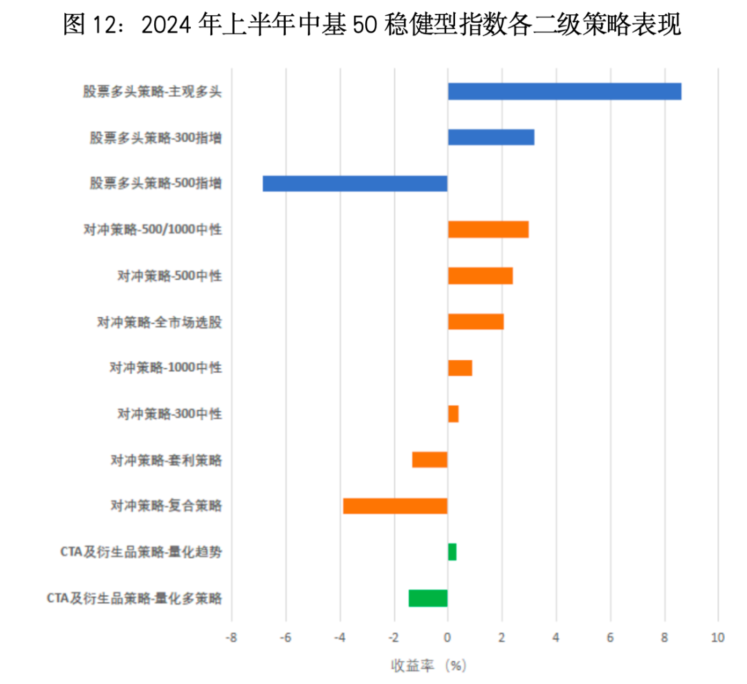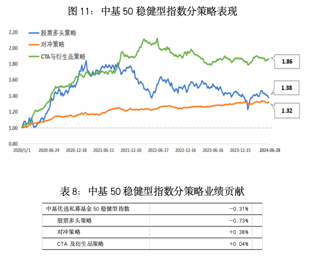 2024年上半年,中基50稳健型指数基本持平,三大策略中对冲策略贡献了0.38%,股票多头策略亏损0.73%,CTA与衍生品策略盈利0.04%。
