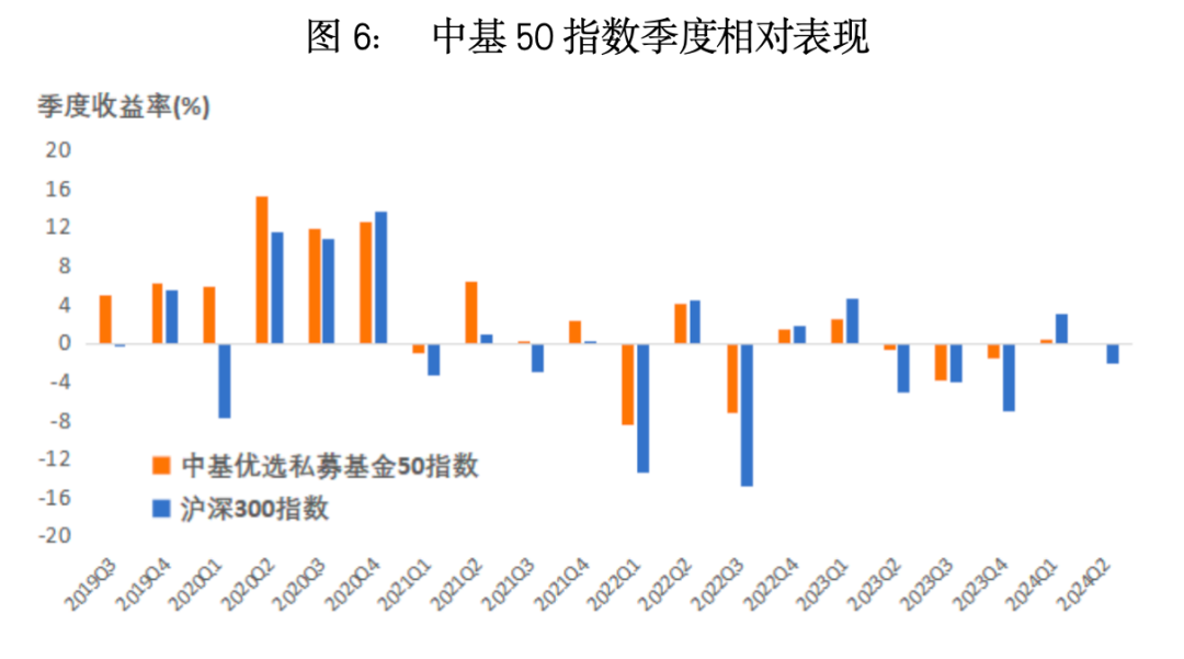 在自2019年第三季度起至今的20个季度中,中基优选私募基金50指数有15个季度跑赢指数,尤其是在沪深300指数出现下跌的10个季度中,中基50指数均跑赢沪深300指数。