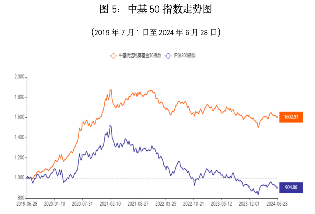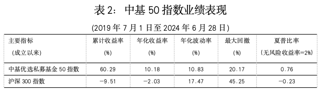 2024年上半年,中基50指数小幅跑输沪深300指数;最近一年,中基50指数跑赢沪深300指数并获得5.44%的超额收益;基准日2019年7月1日至今,中基50指数累计盈利60%,而沪深300指数下跌9.51%,超额收益近70%。