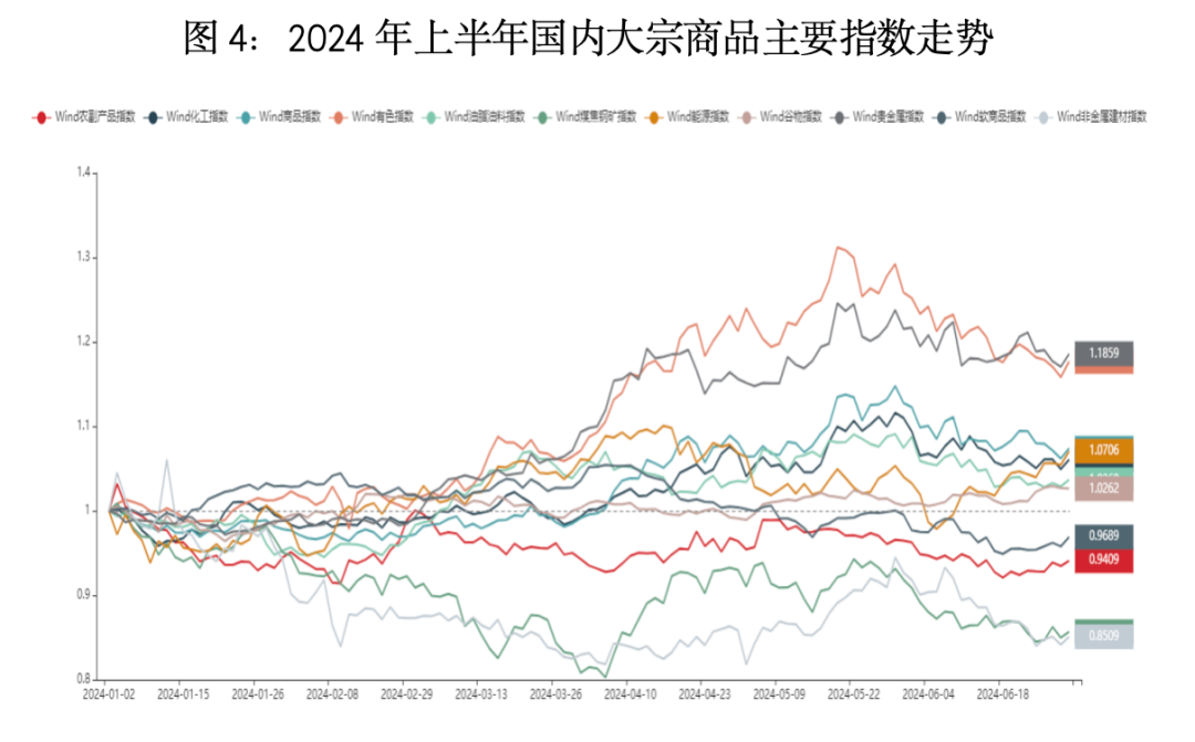 大宗商品市场方面,美国等经济体维持高利率以及局部地缘冲突的升级促使避险情绪升温,贵金属在上半年涨幅较大,有色板块也有一定的涨幅。全球经济疲软导致能源需求下降,国际原油价格有所走低,为此欧佩克+决定延长减产协议,油价趋于稳定。国际农产品价格整体走低。国内商品市场方面,房地产拖累黑色、建材等相关板块价格,化工板块较为稳定,农产品走势多数跟从国际市场。生猪和航运期货涨幅显著,其中生猪在行业周期的推动下价格走高,欧线航运期货在红海局势紧张的形势下大幅上涨。