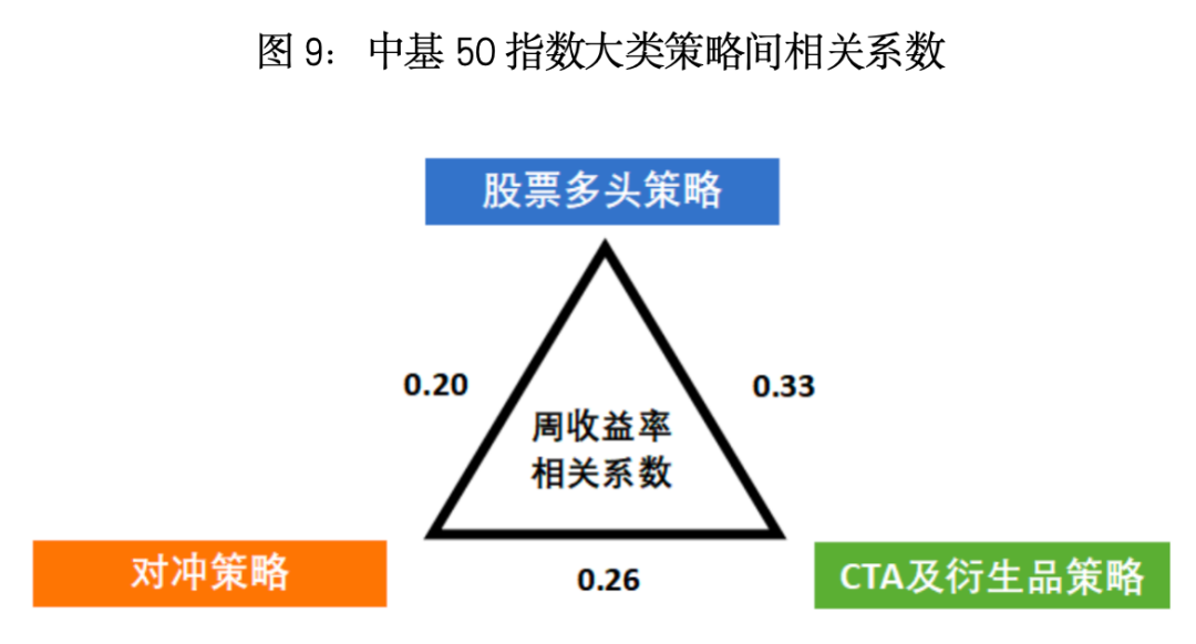 各类策略内基金的相关性也较低,股票策略的表现由于受系统性风险这个共同因素的影响,组内成份基金相关系数的平均值为0.58,处于相对较低水平;对冲策略、CTA与衍生品策略的组内成份基金相关系数的平均值分别为0.24、0.30,均处于低度正相关水平,这样的低组内相关性是二级策略差异化配置的成果,使风险在很大程度上得到了分散,是中基50指数获得相对较高夏普比率的主要原因。