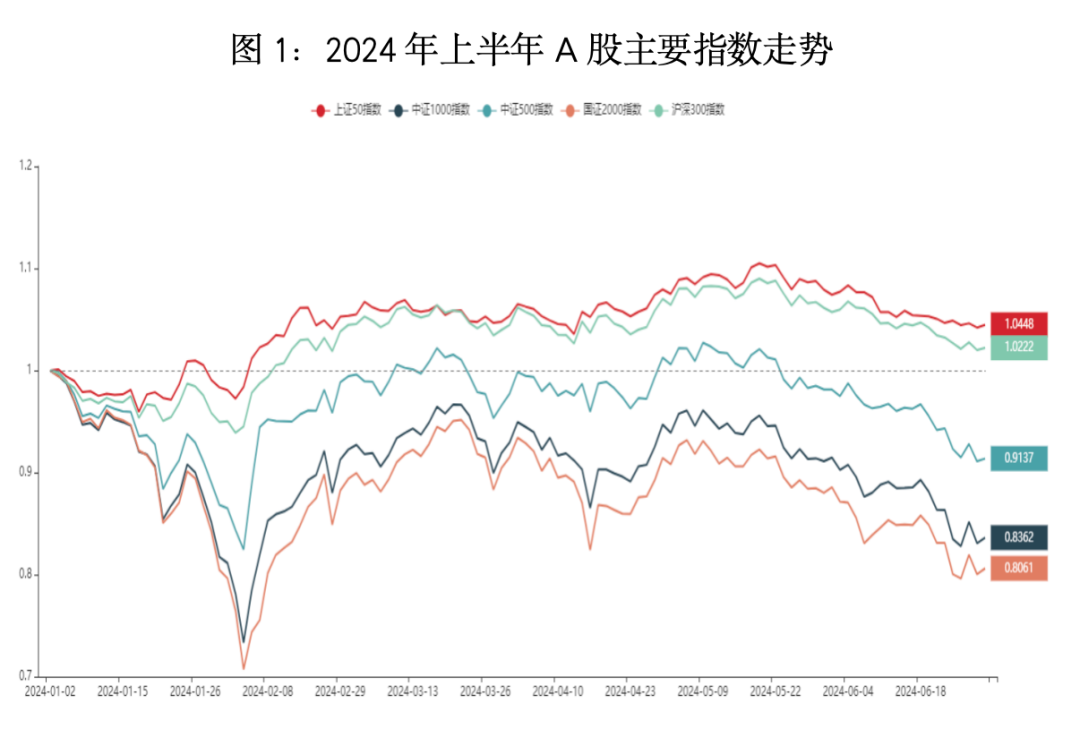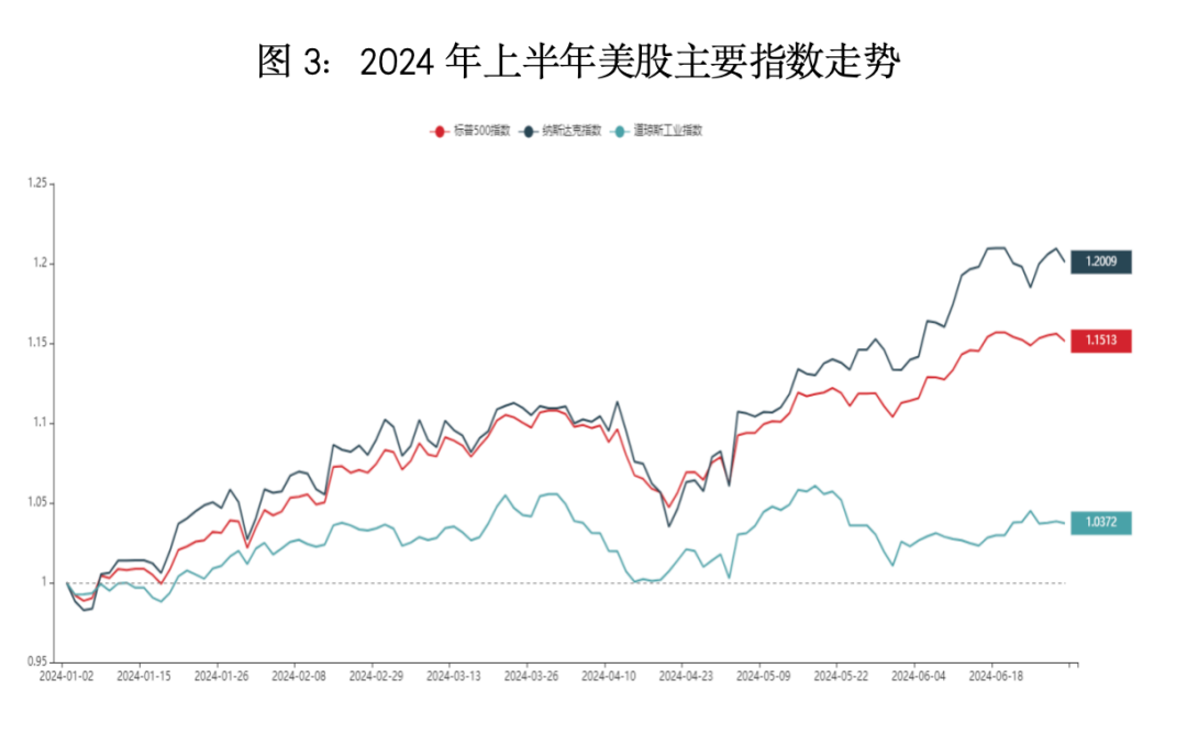 美股方面,在降息预期的推动下,上半年美股以上涨为主。一季度上涨过后,美股对利率政策较为敏感,美联储官员的鹰派言论导致市场走低。随后在美国较好的经济、就业数据的支撑下,以及AI板块的推动下,纳指、标普500指数重拾升势,道指则表现平平。