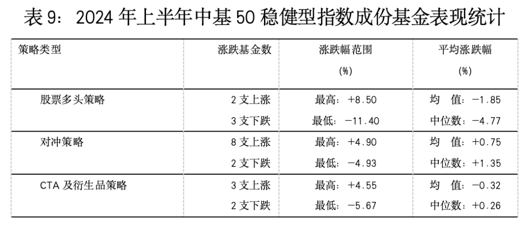 2024年上半年,中基50稳健型指数20支成份基金中有13支基金净值上涨,对冲策略、CTA及衍生品策略下的多数成份基金盈利。