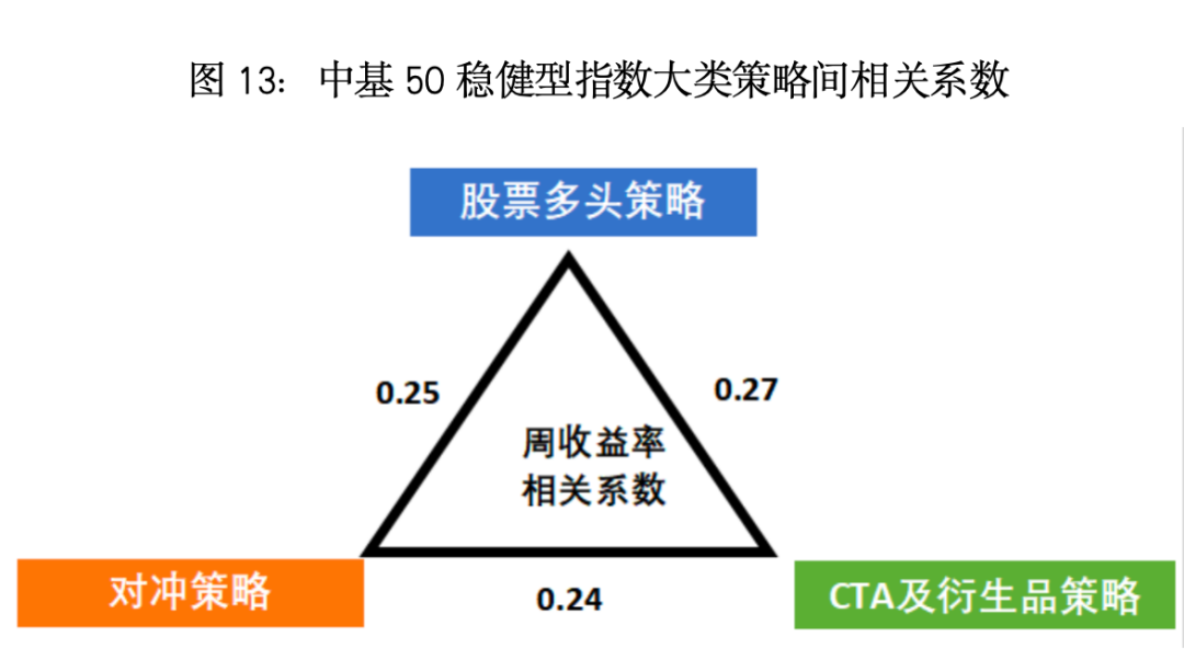 相比于沪深300指数,中基50指数在收益和风险指标上均有相对优异的表现,这主要源于中基50指数三大策略之间的低相关性,三类策略两两之间的相关性最高不超过0.35,属于中低度相关水平,相关性最低的两类策略为股票多头策略和对冲策略,相关系数低至0.20。整体上看,策略间低相关度使得三类策略的表现在波动上具有一定的互补性,有利于降低指数的波动率,策略的正收益部分则会叠加起来,使中基50指数能以相对较低波动的方式获得收益,指数的风险收益比也会相对有所提高。