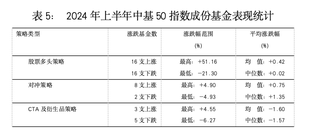 2024年上半年,中基50指数的50支成份基金中有27支基金净值上涨,三类策略中,对冲策略的多数成份基金盈利。