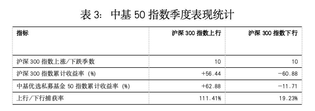 2019年第三季度以来,沪深300指数有10个季度上涨,累计上涨幅度为56%,中基50指数在这些月份中涨幅达到62%,从比例上看捕获了沪深300指数近111%的涨幅,表明中基50指数获得了超过沪深300指数涨幅的收益,显示出优异的收益捕获能力。