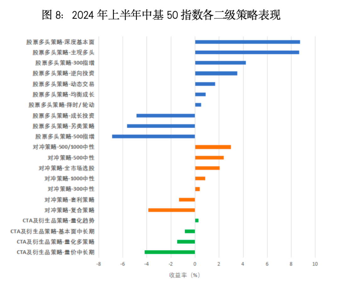 从二级策略的角度上看,2024年上半年各大类策略下的子策略表现鲜明,股票多头策略下基于基本面的多种策略盈利突出;对冲策略下多数子策略获得了盈利;CTA及衍生品策略中仅有量化类策略获得盈利。
