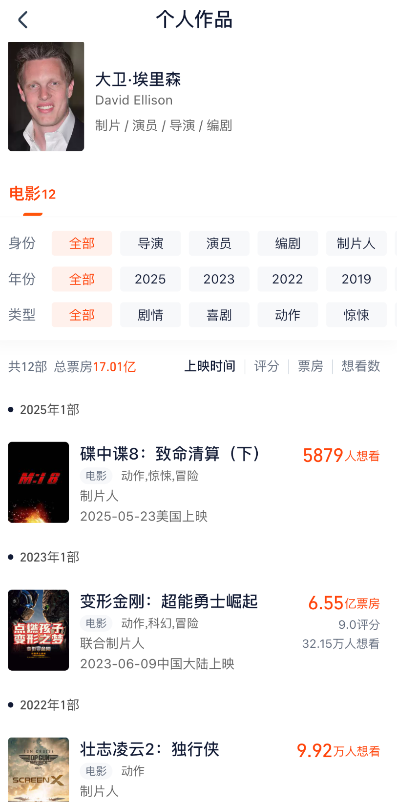 公开资料显示,大卫·埃里森的身份包括制片人、演员、编辑。2010年,天舞传媒宣布与派拉蒙达成合作,将为派拉蒙未来几年的影片提供3.5亿美元融资,包括大部分重磅IP。