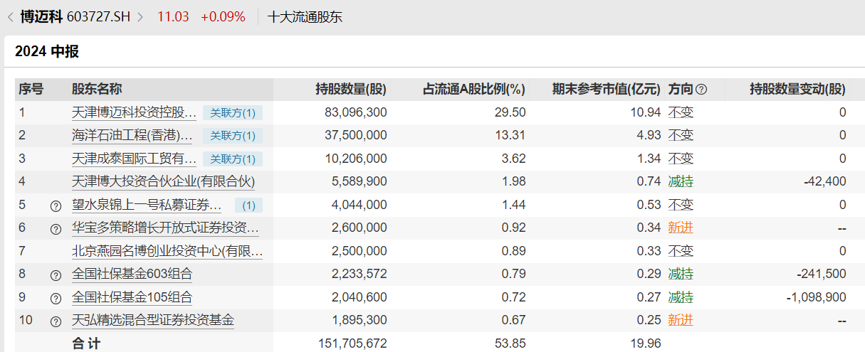 博迈科的前十大流通股东中,全国社保基金603组合、全国社保基金105组合分别以223万股和204万股的持股数排在第八位和第九位,这两个组合在二季度分别减持了24万股和110万股。