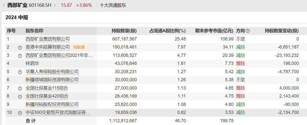 再看西部矿业的前十大流通股东,全国社保基金115组合、全国社保基金420组合分别增持了400万股和214万股,持股数分别达到2700万股和2644万股,排在第七位和第八位。