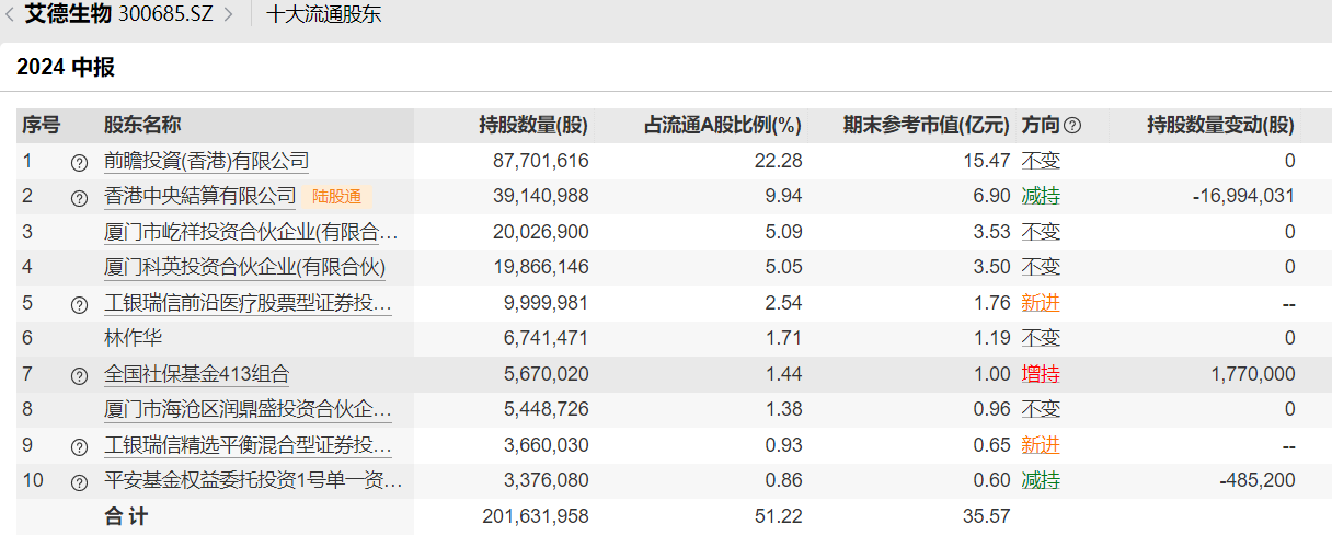 还有艾德生物刚刚披露的半年报显示,全国社保基金413组合加仓了177万股,持股数增加到了约567万股,排在前十大流通股东的第七位。