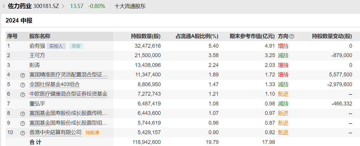 比如,佐力药业刚刚披露的半年报显示,全国社保基金403组合减持了约298万股,不过仍以约881万股的持股数排在前十大流通股东的第五位。