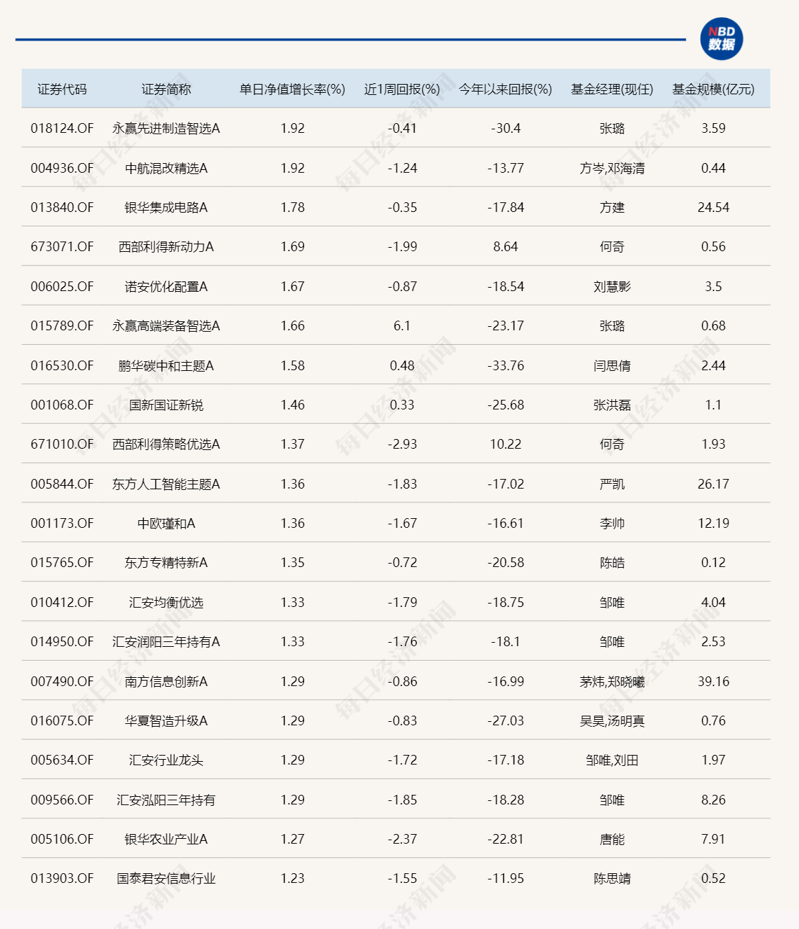 点评:截至二季度末,今日领涨的永赢先进制造智选重仓股情况如下。需指出的是,该产品涨幅略逊于两只房地产ETF。