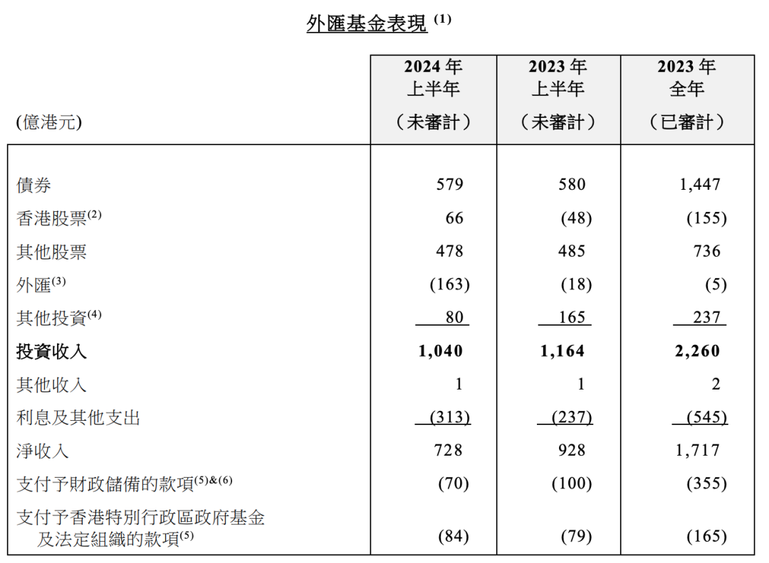 公告显示,外汇基金在2024年上半年录得1040亿港元的投资收入,其主要组成部分包括:债券投资收益579亿港元;香港股票投资收益66亿港元;其他股票投资收益478亿港元;非港元资产外汇估值下调163亿港元:其他投资收益80亿港元。