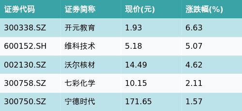截至午间收盘,钠离子电池主题涨跌幅最高的五只股票为:开元教育(300338.SZ)、维科技术(600152.SH)、沃尔核材(002130.SZ)、七彩化学(300758.SZ)与宁德时代(300750.SZ)。详情见下表: