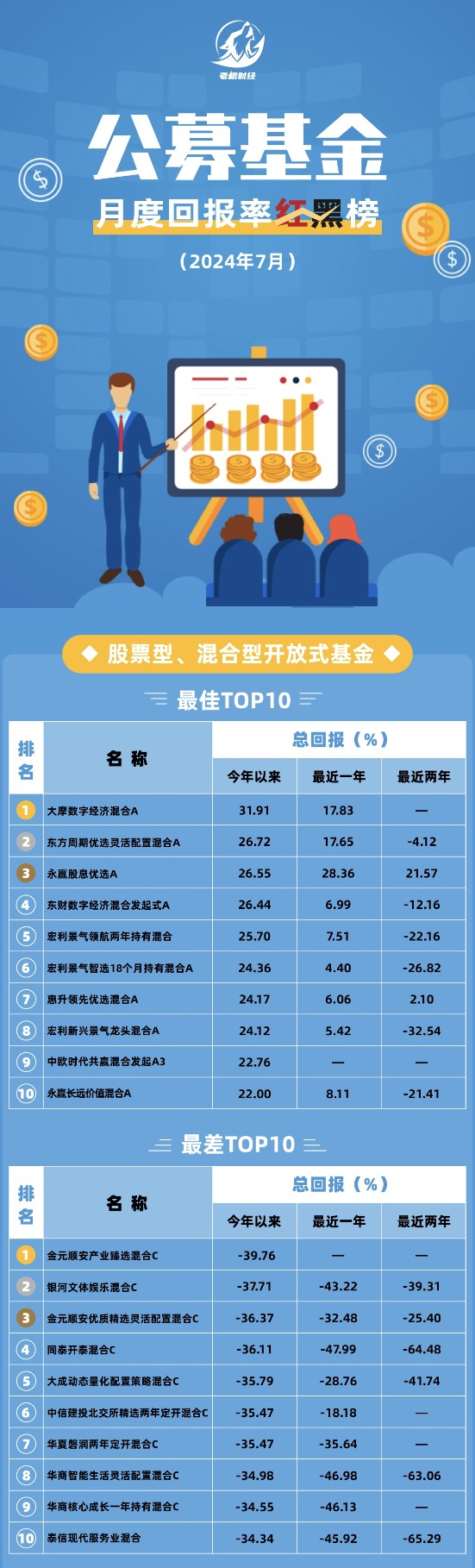 狼叔独家出品,2024年7月《公募基金月度回报率TOP10》来了。根据东方财富Choice数据(下同),截至7月31日,全市场19085只基金中,有10443只产品在年内取得正收益,占比54.72%。A股市场权益类基金整体表现有所回升,但首尾业绩差距达到了70%,前7月排名第一的大摩数字经济混合A年内收益率为31.91%,排名倒数第一的金元顺安产业臻选为-39.67%,真是应了那句老话——选择大于努力。