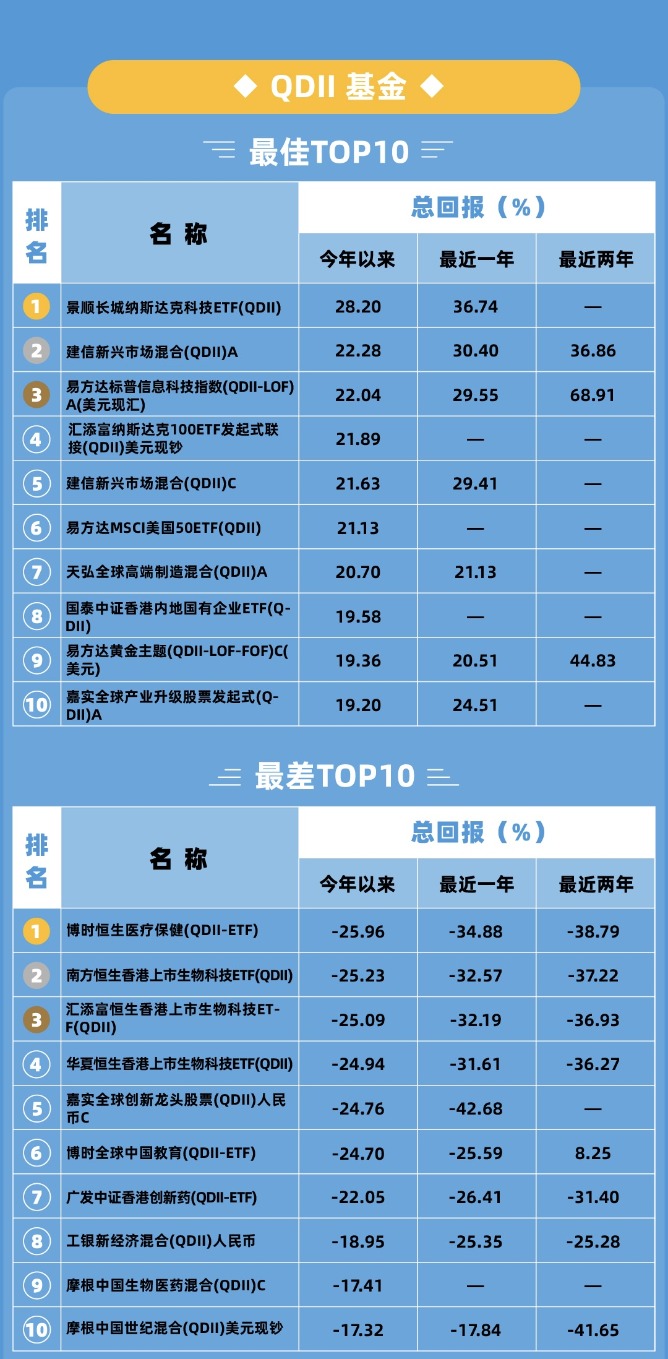 QDII TOP10继续由美股市场基金霸榜,但相对于6月榜单,领跑的美股市场基金年内收益率明显缩水,如蝉联TOP1的景顺长城纳斯达克科技ETF,6月榜单业绩是上涨33.01%,7月榜单业绩就变成了上涨28.20%。