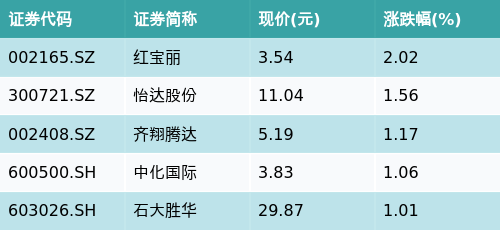 截至收盘,环氧丙烷主题涨跌幅最高的五只股票为:红宝丽(002165.SZ)、怡达股份(300721.SZ)、齐翔腾达(002408.SZ)、中化国际(600500.SH)与石大胜华(603026.SH)。详情见下表: