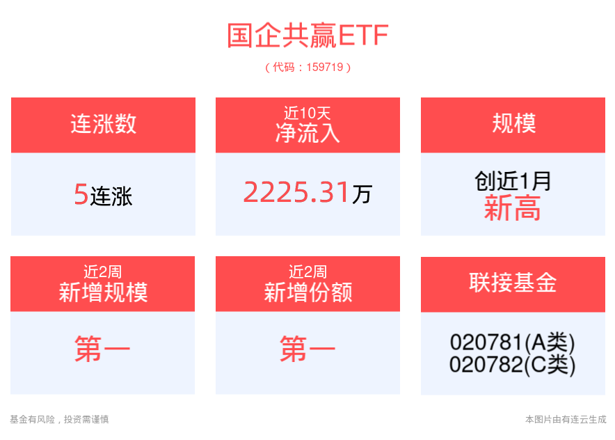 规模方面,国企共赢ETF最新规模达2.13亿元,创近1月新高。份额方面,国企共赢ETF近2周份额增长1500.00万份,实现显著增长,新增份额位居可比基金第一。资金流入方面,国企共赢ETF近10个交易日内,合计“吸金”2225.31万元。