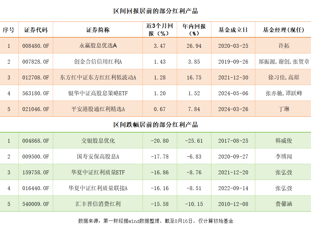 在调整背景下,红利主题产品也多有回撤。据第一财经统计,截至8月16日,名称中带有“红利”或“股息”的基金产品共有189只(不同份额合并计算,仅计算初始基金)中,有14只产品近三个月来的累计回报为正,占比不足8%。