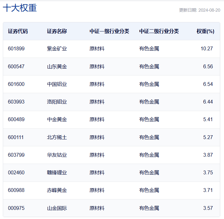 再看中证有色金属矿业主题指数,前十大权重的累计占比为55.38%,其中紫金矿业的权重占比超8%。