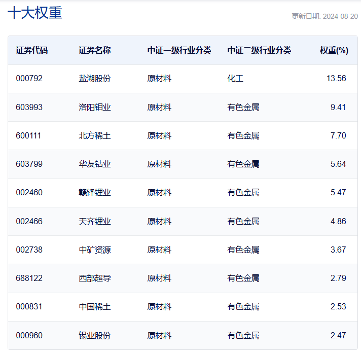 再从前十大权重股来看,中证稀有金属主题指数前十大权重的累计占比为58.09%,其中盐湖股份、洛阳钼业的权重占比超8%。