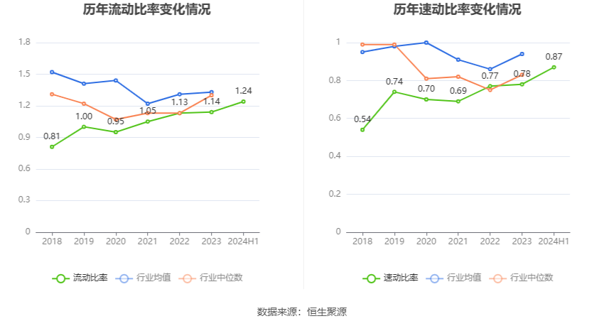 2024年上半年,公司流动比率为1.24,速动比率为0.87。