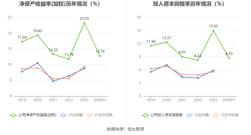 盈利能力方面, 2024年半年度公司加权平均净资产收益率为12.79%,同比上升4.47个百分点。公司2024年上半年投入资本回报率为8.7%,较上年同期上升3.41个百分点。
