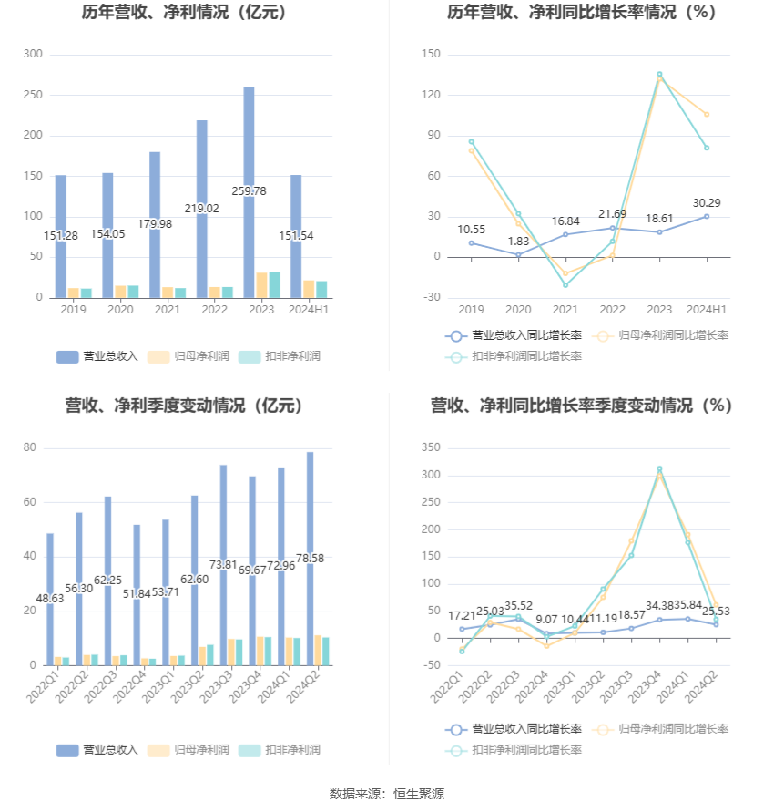 根据半年报,公司第二季度实现营业总收入78.58亿元,同比增长25.53%,环比增长7.71%;归母净利润11.18亿元,同比增长61.85%,环比增长8.13%;扣非净利润10.37亿元,同比增长35.21%,环比增长2.20%。