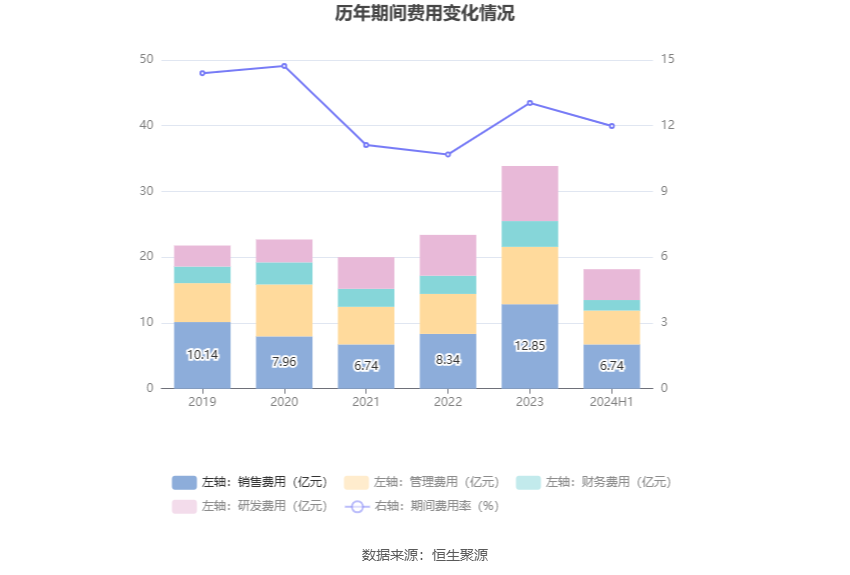 2024年上半年,公司期间费用为18.17亿元,较上年同期增加3.99亿元;但期间费用率为11.99%,较上年同期下降0.20个百分点。其中,销售费用同比增长32.55%,管理费用同比增长31.36%,研发费用同比增长23.27%,财务费用同比增长16.3%。
