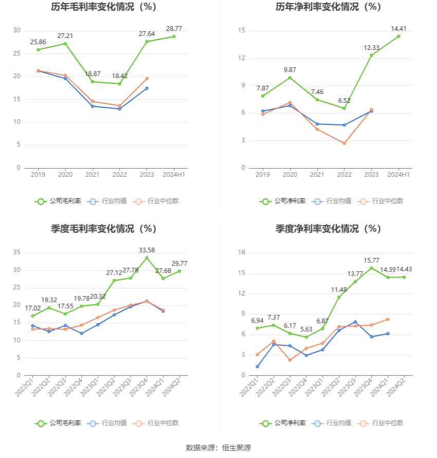 2024年上半年,公司毛利率为28.77%,同比上升4.79个百分点;净利率为14.41%,较上年同期上升5.06个百分点。从单季度指标来看,2024年第二季度公司毛利率为29.77%,同比上升2.65个百分点,环比上升2.09个百分点;净利率为14.43%,较上年同期上升2.95个百分点,较上一季度上升0.04个百分点。