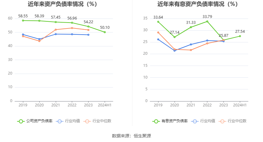在偿债能力方面,公司2024年上半年末资产负债率为50.10%,相比上年末下降4.12个百分点;有息资产负债率为27.54%,相比上年末上升1.67个百分点。